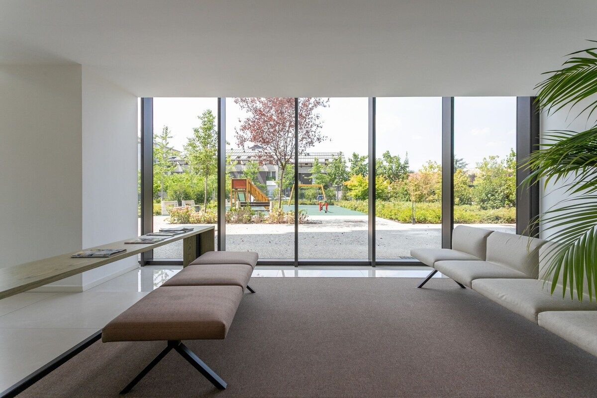 The apartment of approximately 55 m2 is located on the fifth floor with lift and is equipped with a centralized cooling system, underfloor heating, electric shutters and parquet flooring. The apartment as well as the building are recently built and feature new, high-quality furnishings and finishes. Upon entering we find the living area with a table for 4 people, a double sofa bed, a 55 inch smart TV and access to the large terrace with a splendid view of the surrounding greenery and... The spac...